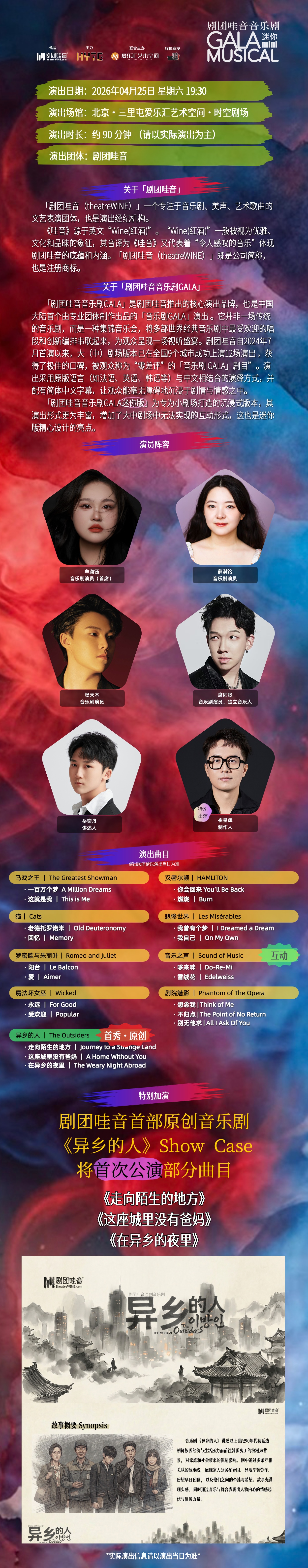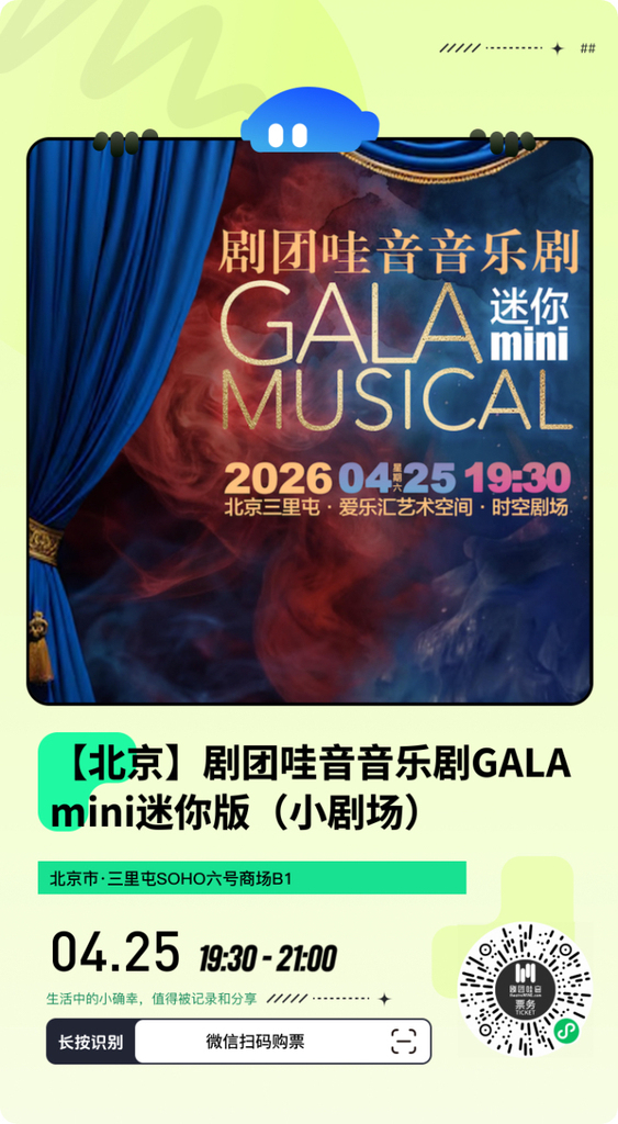 剧目名称:剧团哇音音乐剧GALA mini小剧场版演出日期:2026年04月25日(星期六)演出时间:19:30 – 21:00 (1.6小时)演出地点:北京·三里屯爱乐汇艺术中心·时空剧场中场休息:无观众字幕:中文摄影摄像:不允许(返场曲目及谢幕部分允许)开票状态:2026年3月14日